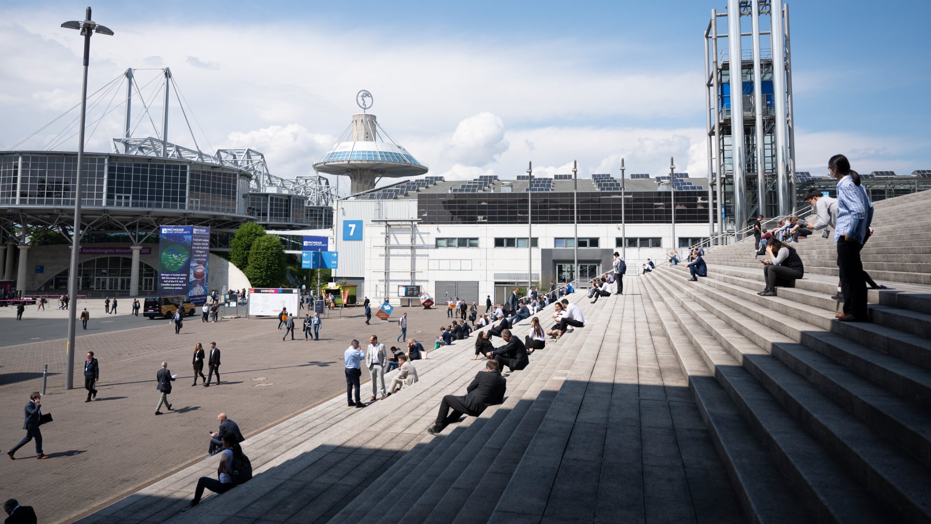 The "Platz der Nationen" is characterised by its large and wide entrance staircase and the existing grandstand with a view of the sunset. This area has its own entrance and a connection to the underground and the multi-storey car park.