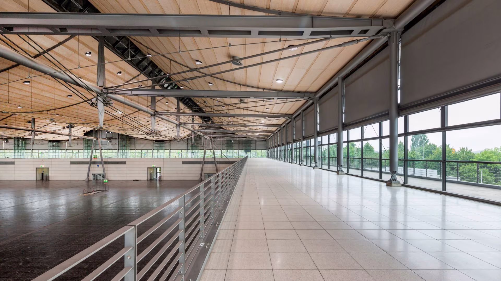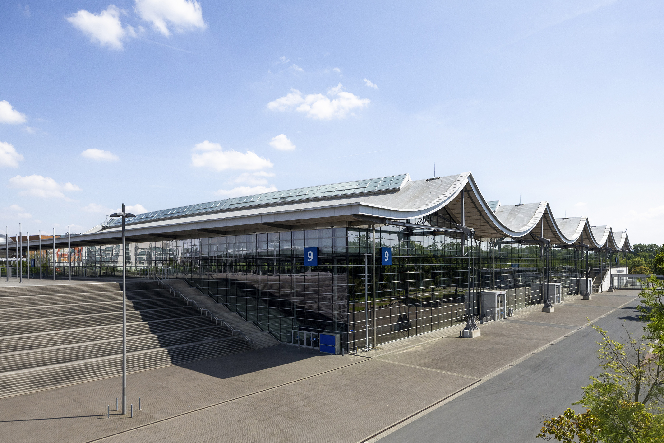 With over 23,000 m² of column-free event area, Hall 9 wins over with its unique atmosphere and extraordinary wood ceiling construction. The material mix of wood, steel and glass is representative of this hall and will certainly always be remembered by both you and your guests.